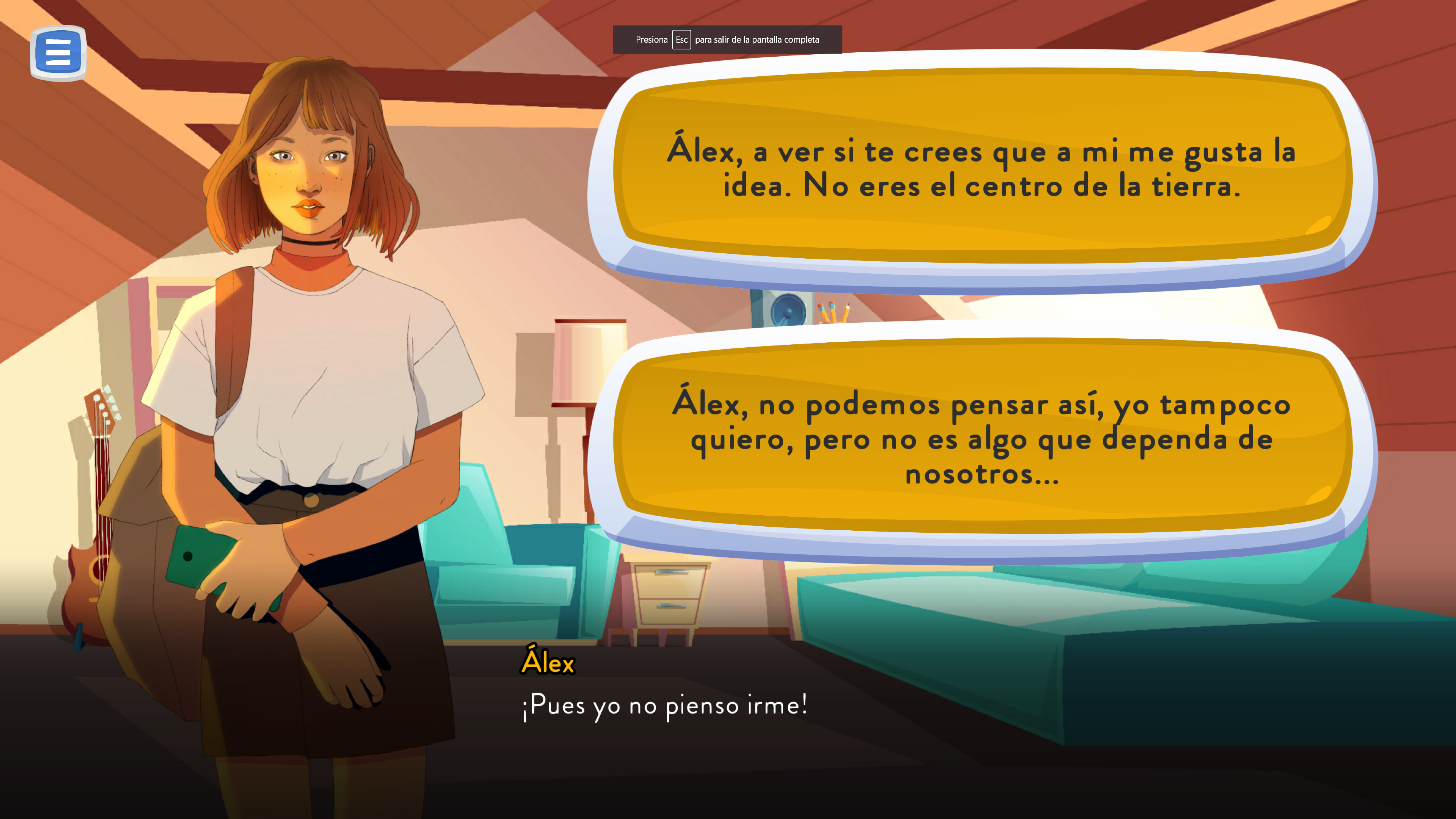 – Alex, ya sabes que yo también tengo amigas como tú… Es posible, pero si papá y mamá lo decidieron así es que es lo único que podemos hacer en este momento. Entiendo que a ellos tampoco les hace mucha ilusión tener que irse…