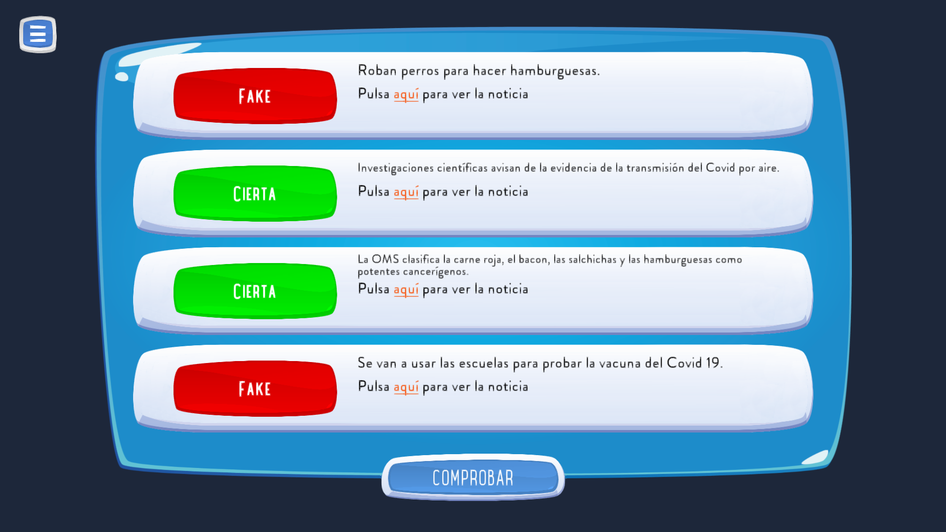 El juego comenzará con una pantalla en la que aparecen cuatro noticias, dos de ellas son fake news y dos de ellas son verdaderas.